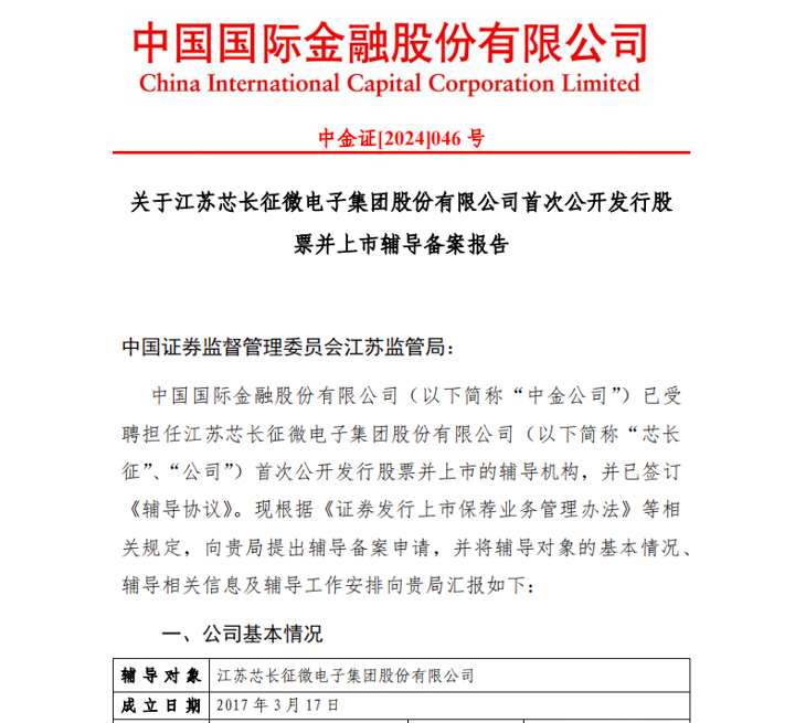 近日,证监会披露了关于江苏芯长征微电子集团股份有限公司(简称:芯长征)首次公开发行股票并上市辅导备案报告。中金公司已受聘担任芯长征首次公开发行股票并上市的辅导机构,并已签订《辅导协议》。