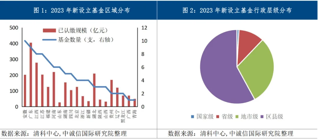 伴随政府引导基金逐步发展,各地招商引资、助力产业发展等需求上升,中西部引导基金加速设立。根据清科数据,2023年新设基金数量排名前三的省份分别为安徽、广东、江苏和江西(并列),已认缴规模排名前三的省份依次为广东、江西、河南。目前政府引导产业基金已逐步下沉至区县,区县基金数量占比逐年上升。